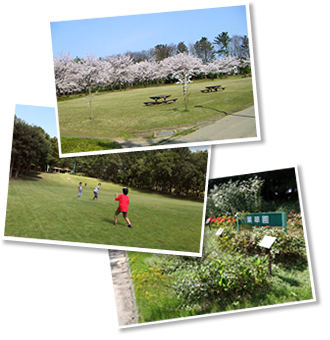 これらの樹林の間には、10ヶ所の芝生広場、そして野球場、スポーツ広場、テニスコートさらに薬草園、市町村の木のコーナー、万葉の木のコーナーなど興味のある施設も配置されております。また、園内には延べ6.4kmの変化に富んだ遊歩道があり、緑の中の散策や、ジョギング等いろいろ楽しめます。